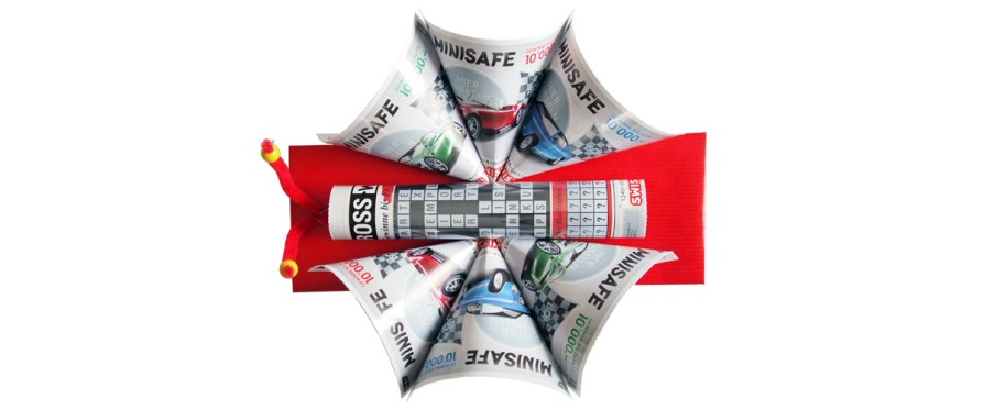 Für den Körper können Sie das Crossword-Los rollen und mit Cellophan einfassen. Das Cellophan können Sie einfach mit einem Klebestreifen zusammenkleben. (Es muss nicht das ganze Los eingefasst werden. Das Celophan dient dazu, dass kein Klebestreifen auf das Los angebracht werden muss und die Rubbelschicht nicht beschädigt wird).