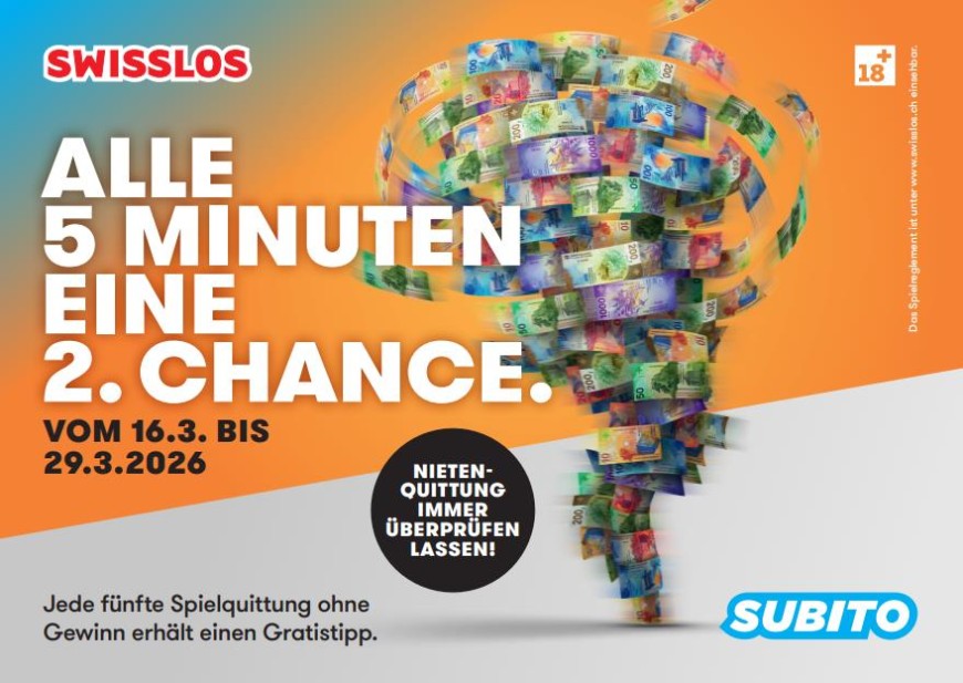 Vom 16.03 bis maximal 29.03.2026 gewinnt jede fünfte eingelöste Nieten-Spielquittung sofort einen Gratistipp im Wert von 4 Franken.