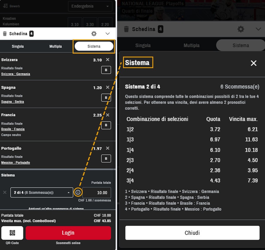 Scegli un sistema, ad esempio «2 su 4». Ciò significa che vengono effettuate in totale 6 scommesse (puntata minima 6 franchi). Per vincere, almeno 2 pronostici devono essere corretti (il primo numero del sistema). Con la selezione del sistema vengono automaticamente giocate tutte le possibili combinazioni dei tuoi pronostici. La puntata viene distribuita in modo uniforme su tutte le scommesse. Se 3 pronostici sono corretti, vincono più combinazioni. La vincita massima indicata viene raggiunta solo se tutti e 4 i pronostici sono corretti. È necessario puntare almeno 1 franco per scommessa.